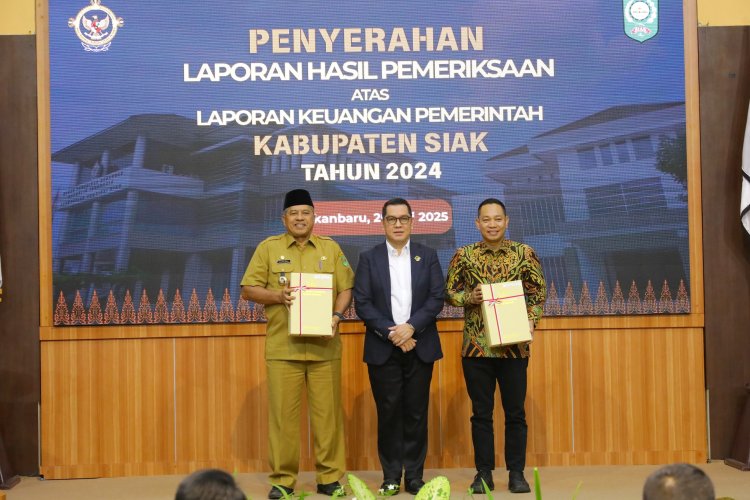 TOPIKPUBLIK.COM - PEKANBARU - Pemerintah Kabupaten Siak kembali menunjukkan komitmennya dalam pengelolaan keuangan yang akuntabel dan transparan dengan berhasil mempertahankan Opini Wajar Tanpa Pengecualian (WTP) untuk ke-14 kalinya secara berturut-turut. Penghargaan prestisius dari Badan Pemeriksa Keuangan (BPK) RI tersebut diserahkan langsung oleh Kepala Perwakilan BPK RI Provinsi Riau, Binsar Karyanto, kepada Bupati Siak Alfedri, pada acara penyerahan Laporan Hasil Pemeriksaan (LHP) Laporan Keuangan Pemerintah Daerah (LKPD) tahun anggaran 2024, yang digelar di Auditorium Kantor BPK RI Perwakilan Provinsi Riau, Jalan Jenderal Sudirman, Pekanbaru, Senin (26/5/2025).