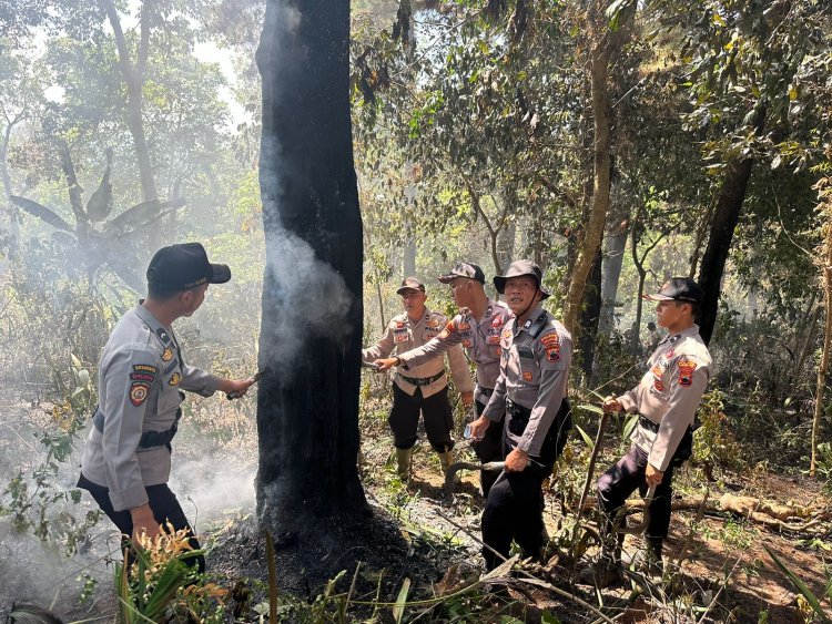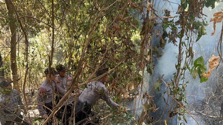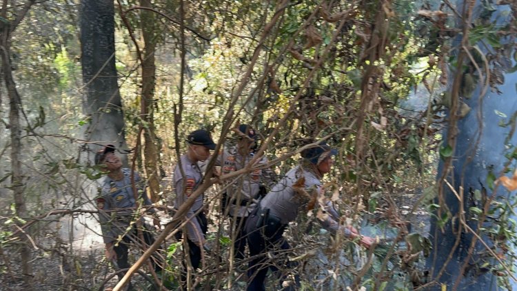 Bersama Petugas Gabungan, Polisi Berusaha Padamkan Kobaran Api di Hutan Pinus Kalijoyo Pekalongan