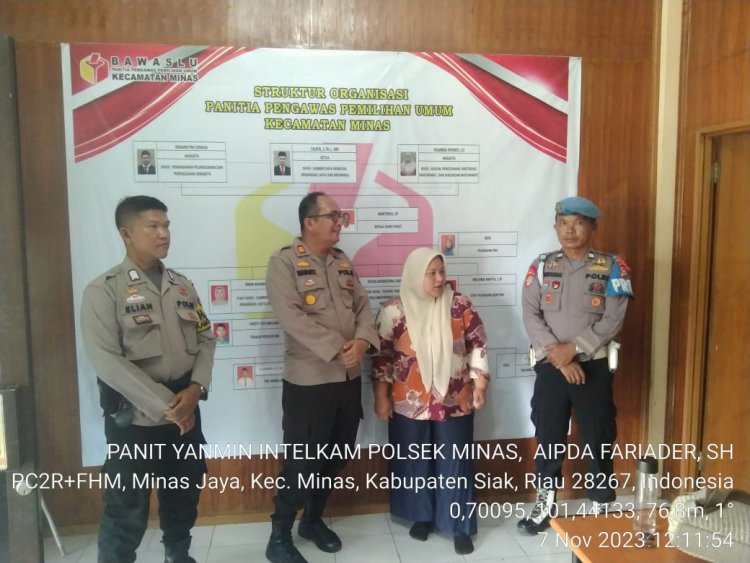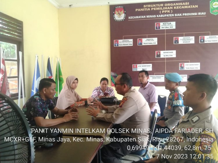 "Giat Patroli dialogis ini kita lakukan terhadap Kantor PPK Minas dan Kantor Panwascam Minas untuk menciptakan situasi yang aman dan kondusif menjelang Pemilu 2024," kata Kapolsek Minas AKP Wan Mantazakka SH MH.