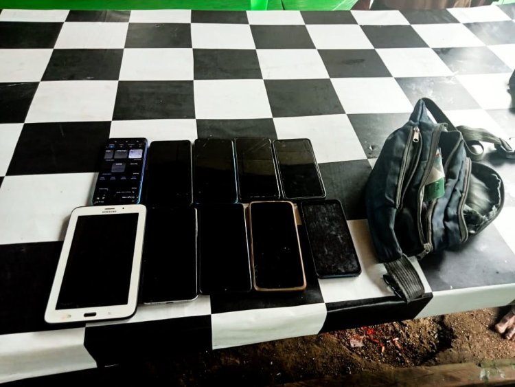 Setelah personel Satgas melakukan pemeriksaan terhadap 2 OTK tersebut ditemukan 10 unit Handphone Android terbungkus dalam kain didalam bagasi Sepeda motor (SPM).