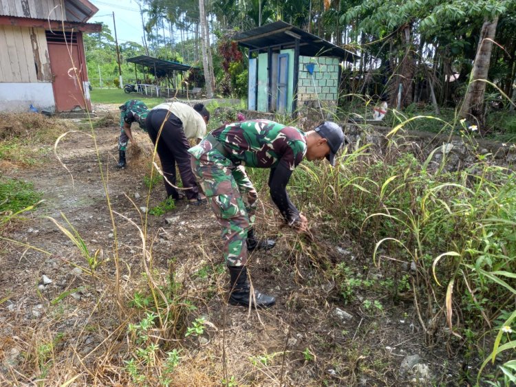 Satgas Pamtas RI-PNG Yonif 122/TS Gelar Karya Bhakti Bersama Masyarakat untuk Membersihkan Gereja