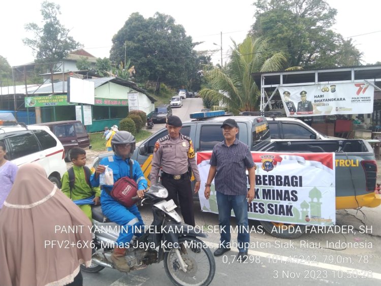 TOPIKPUBLIK.COM - Siak/Riau - Jajaran Personil Polsek Minas - Polres Siak kembali melaksanakan giat rutin Jum'at berbagi kepada para Masyarakat Kecamatan Minas. Kali ini giat itu dialkukan di Pasar Bawah Minas, Jl.Yos Sudarso Km.30, Kelurahan Minas Jaya, Kecamatan Minas, Kabupaten Siak, Riau, Jumat (03/11/2023) sekira pukul 11.00 WIB.