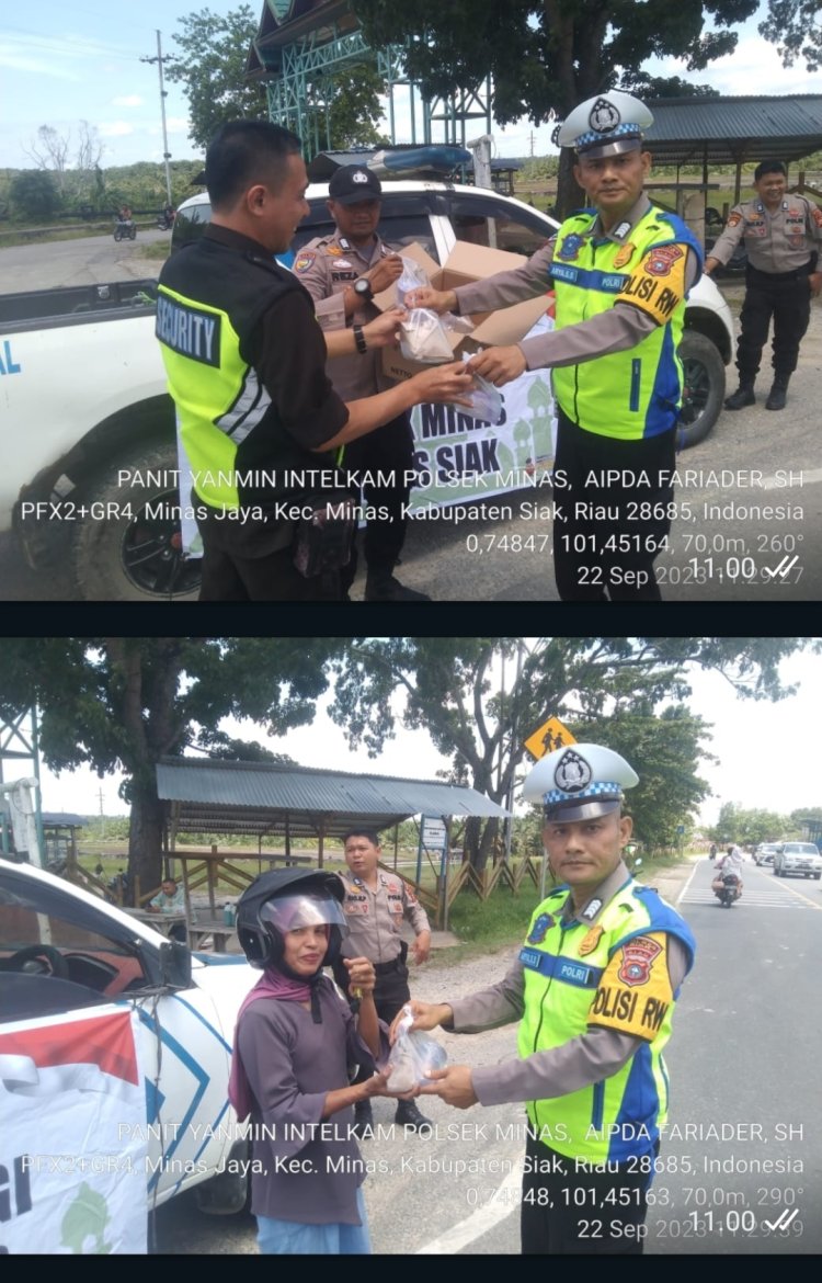 "Pemberian Jumat berbagi Polsek Minas - Polres Siak ini kita berikan kepada masyarakat Kecamatan Minas yang melewati Depan Pasar Bawah Minas dan masyarakat yang akan melaksanakan Sholat Jumat di Masjid Nurul Huda Minas," kata AKP Wan Mantazakka SH MH.