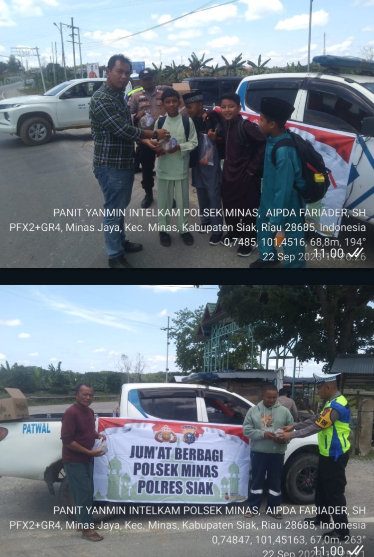 "Kegiatan Jumat berbagi ini merupakan program berbagi yang digelar oleh Polsek Minas - Polres Siak secara rutin," katanya.