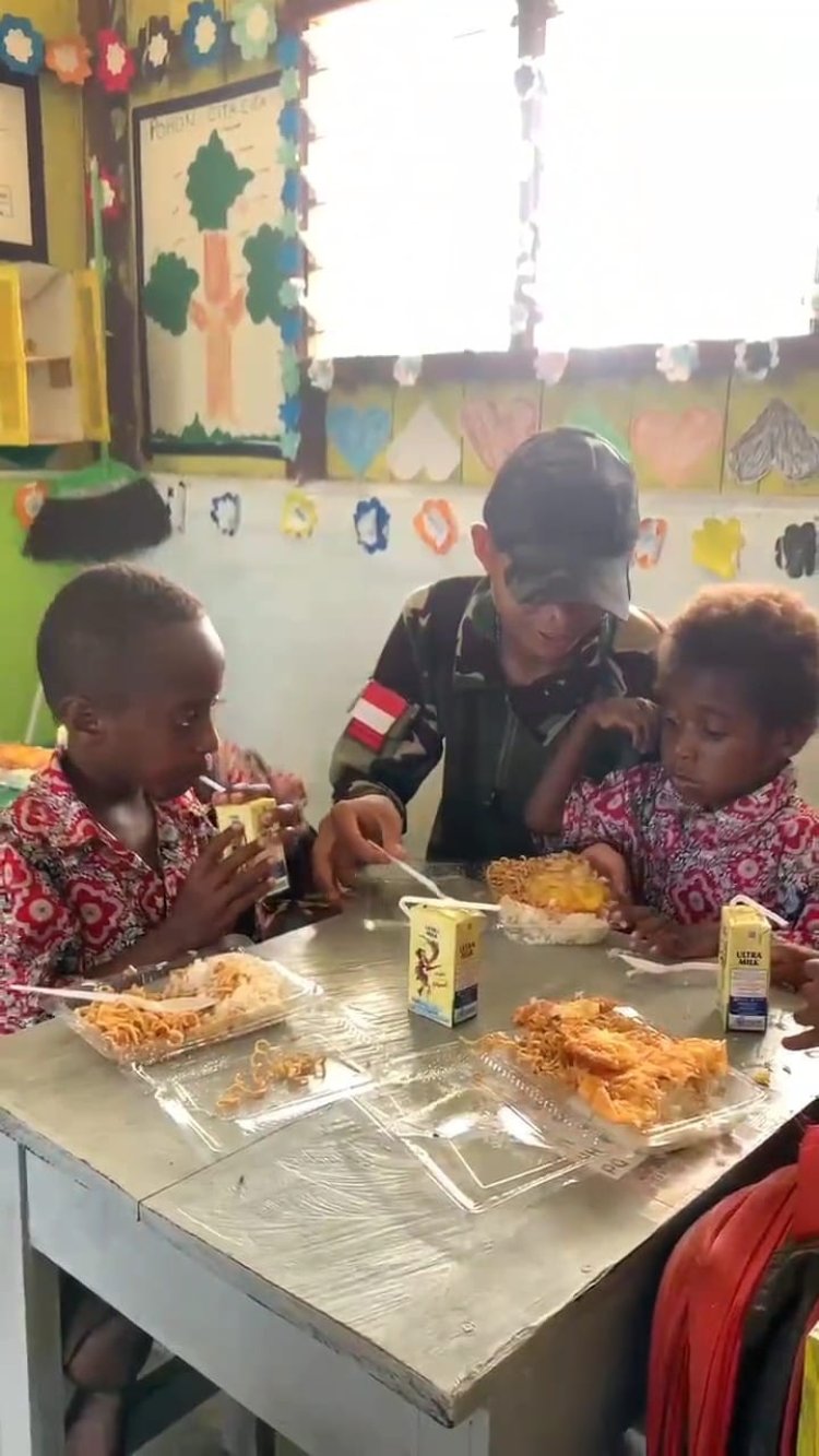 Program MBG Satgas TNI untuk anak-anak Papua, pembinaan teritorial Yonif 642/Kps, makan gratis di TK Mendario Jagiro, kegiatan sosial TNI di Teluk Bintuni